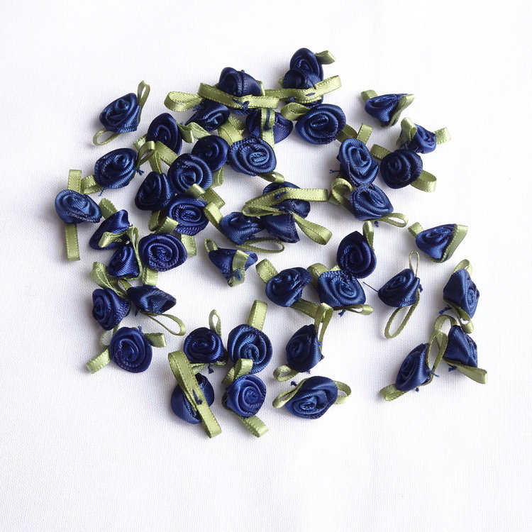 Small Navy Satin Ribbon Roses With Green Satin Ribbon Leaves-