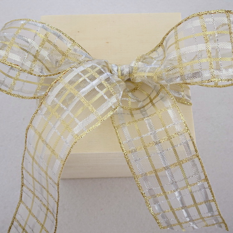 Wired Glitter Lurex Ribbon- Gold & Silver Check- 25mm 40mm Width