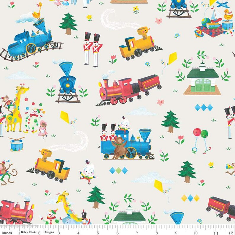 The Little Engine That could collection for Riley Blake Designs is great for quilting, apparel and home decor. This print features images from the beloved children's story, including trains, trees, flowers, giraffes, elephants, toy soldiers, dolls, clowns, flowers, and more-